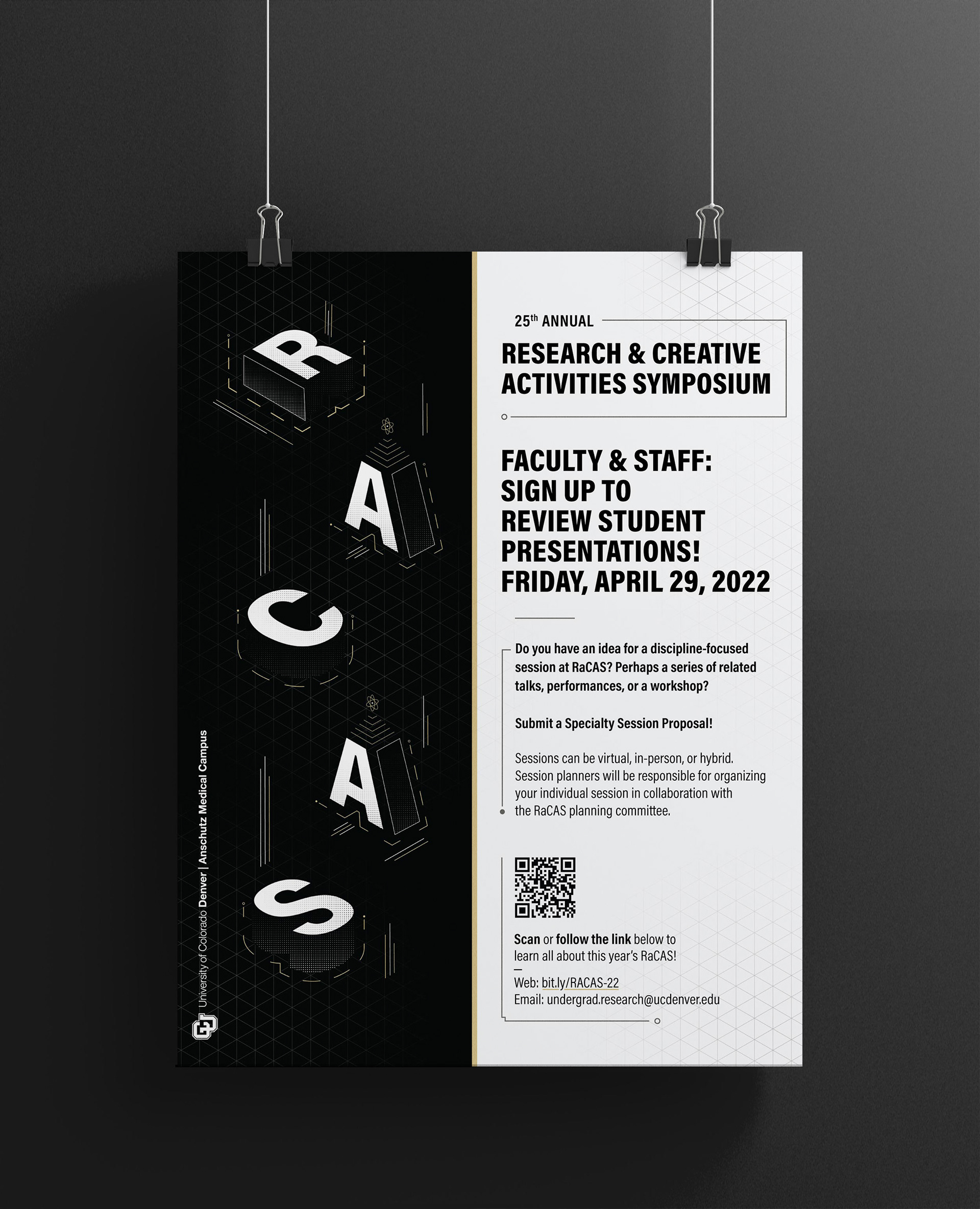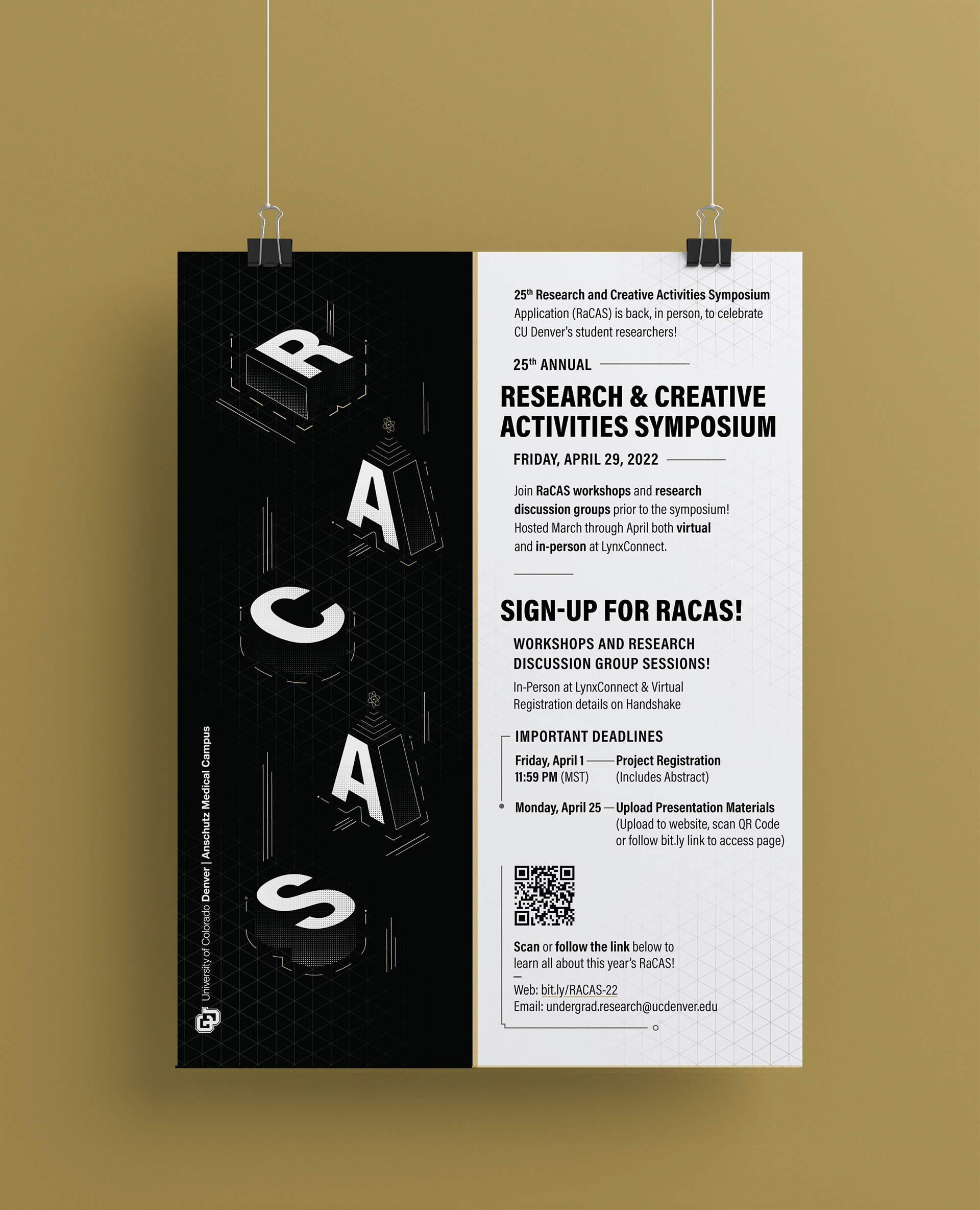 RaCAS is an annual opportunity for CU Denver | Anschutz undergraduate and graduate students to showcase their scholarly activities. Each year over 200 presenters share the research and creative projects they've worked on throughout the academic year. Together with peers, faculty, family, and friends they celebrate the pursuit of knowledge and new ideas.